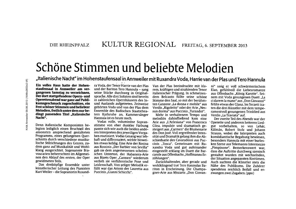 Pressestimmen aus "Badische Neueste Nachrichten" vom Samstag 7. September 2013 und "Die Rheinpfalz" von Freitag 6. September 2013